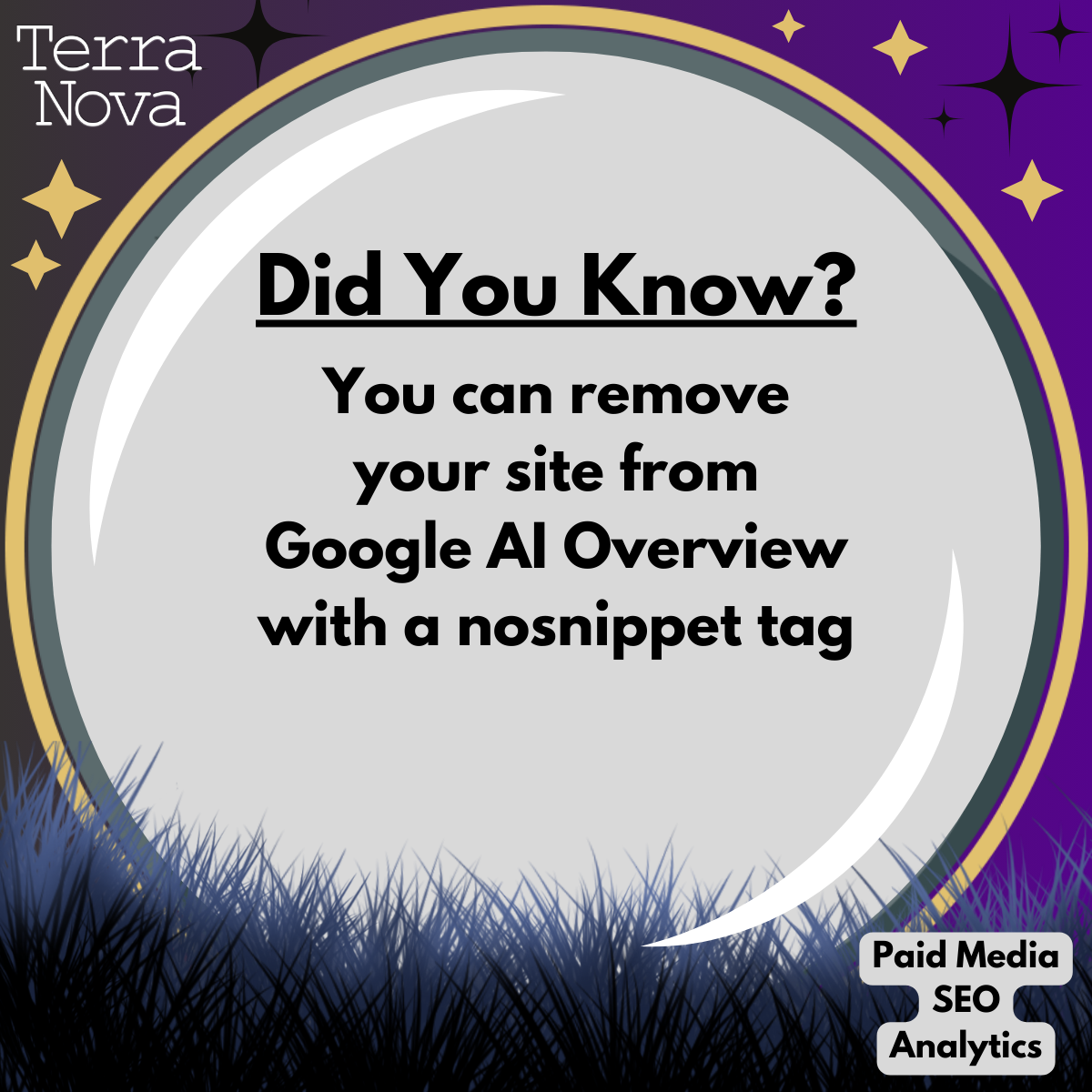 Want to remove your site from Google AI Overview? It is possible with a nosnippet tag! The catch: this will result in no meta description at all. It’s worth weighing the pros and cons of a nosnippet tag before implementation. Reach out to us if you’d like to hear our take.