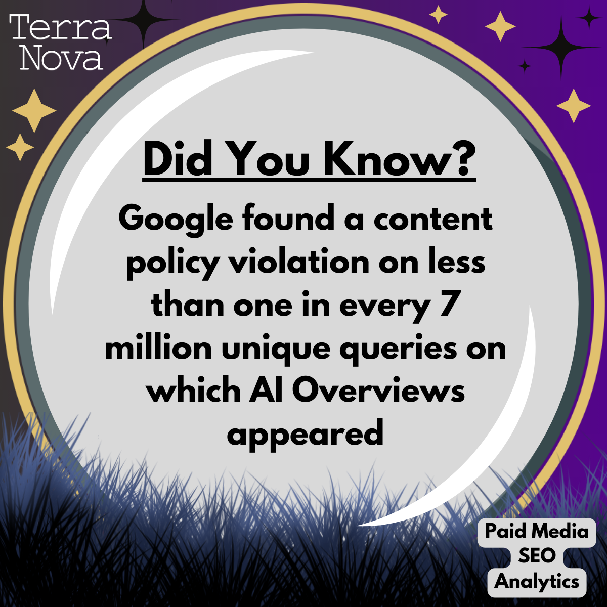 For our third wrap-up of “Did You Know” content, we focused on Google’s new AI Overview. What is it? How is it changing Google search results? Why is it telling me to run with scissors and eat rocks? We stroll through Google’s AI Overview impacts in a review of the Did You Know content we posted on LinkedIn recently. You can follow us on LinkedIn at Terra Nova Advertising to get the updates right as we post them. Or, you can check back to read our wrap-ups where we share everything all at once. Either way, you’re supporting real humans, talking about AI…until AI can do it better. So thanks for reading!